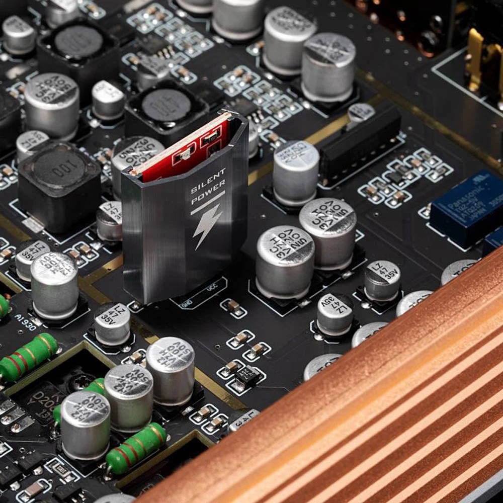 Der Voyager ist mit unseren erstklassigen Silent Power Modules (SPM02) in seinem internen Stromversorgungsschaltkreis ausgestattet. Diese Module sorgen für einen unglaublich niedrigen Rauschpegel von nur 0,8nVrms – mehr als 200 Mal leiser als herkömmliche Leistungsregler. Diese überragende Rauschunterdrückung garantiert ein außergewöhnlich reines Klangbild, so dass jede musikalische Note in unverfälschter Klarheit zu hören ist.