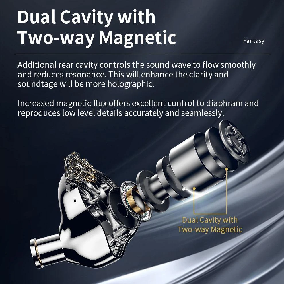 Traditionell haben dynamische Treiber ein Single-Cavity-Design, meist auf der Vorderseite. Cayin hat speziell eine große 10,3 mm dynamische Treibereinheit mit einem Dual-Cavity-Design entwickelt. Es gibt einen Hohlraum auf der Vorderseite und einen weiteren auf der Rückseite der dynamischen Treibereinheit. Diese Dual-Cavities haben im Vergleich zu Single-Cavity-Treibern ein besseres Luftdruckmanagement, was zu einer schnelleren Bewegung der Membranspule führt. Dies führt zu einer insgesamt sanfteren, verzerrungsarmen Ausgabe für seine Benutzer.