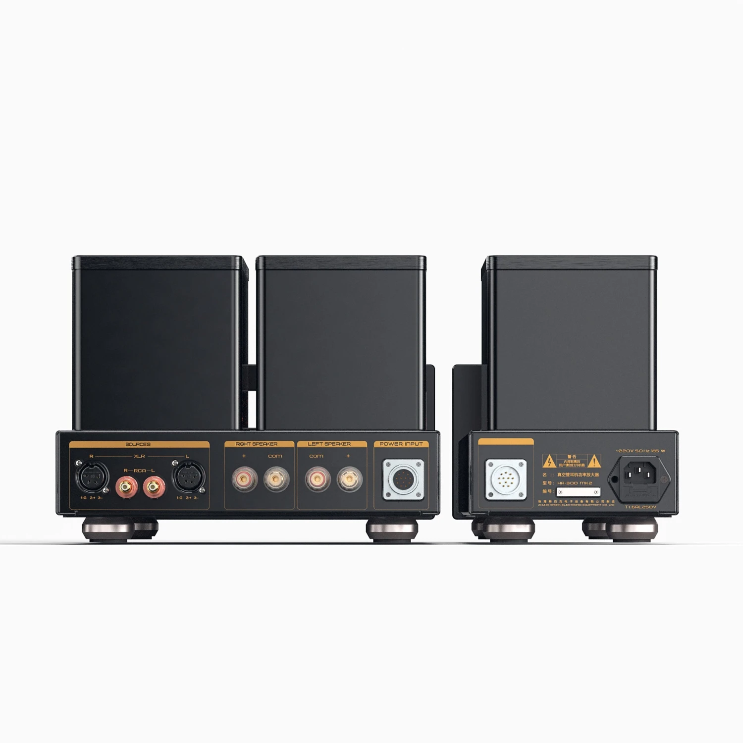 - Der Ausgang des 300B verfügt über ein Paar speziell entwickelter und hochwertiger EI-Ausgangsübertrager für Lautsprecher, unsymmetrisch (6,35 mm) oder symmetrischen (4-pol. XLR und 4,4 mm) Kopfhörerausgang .