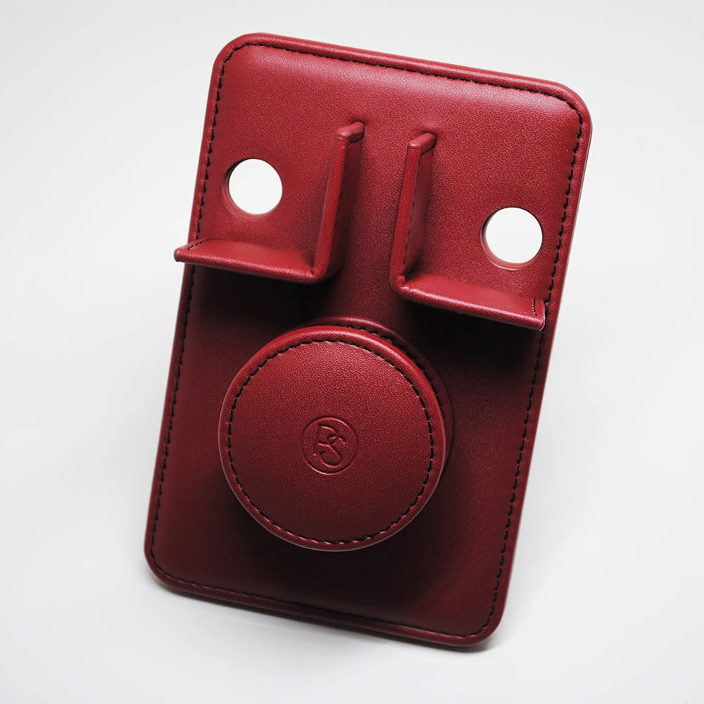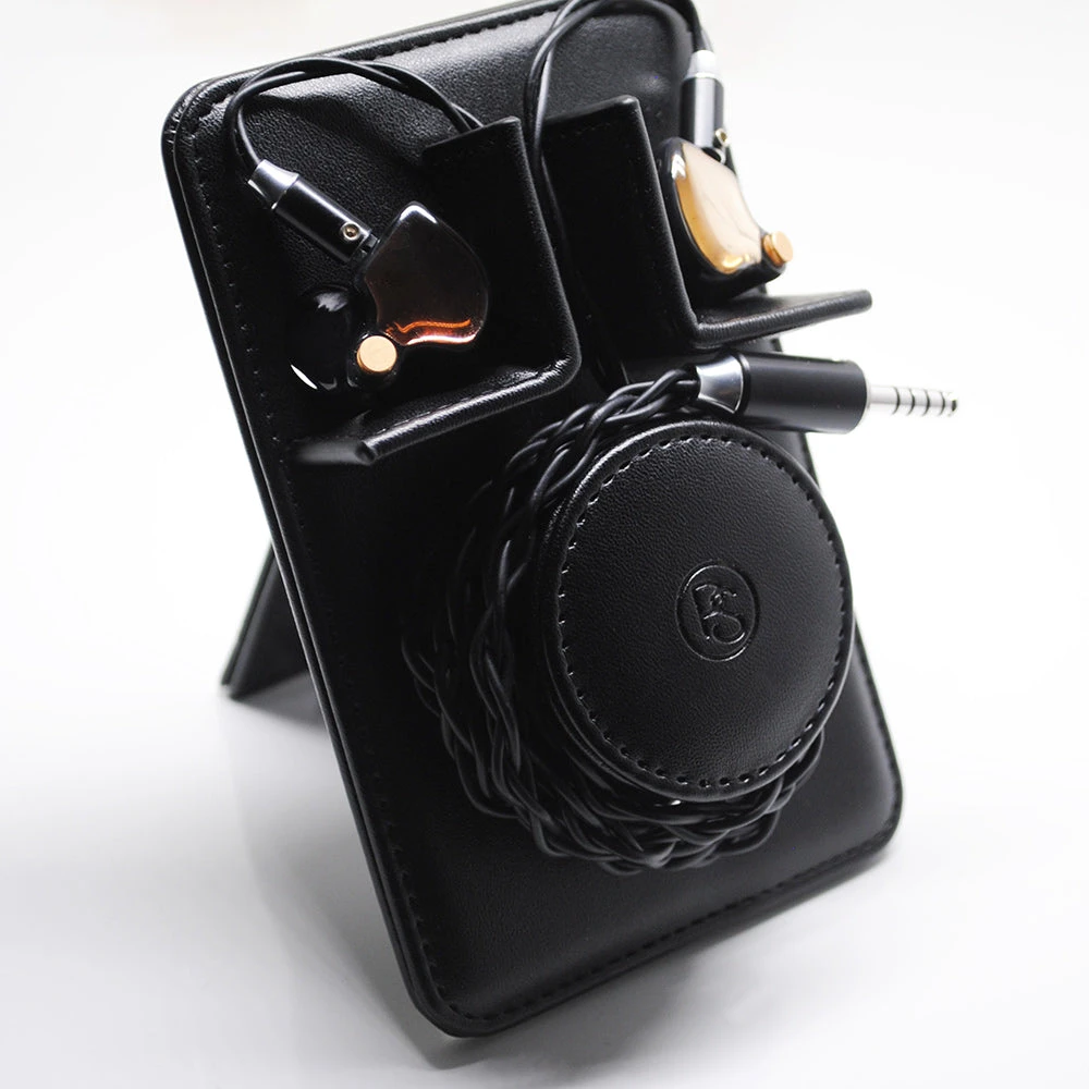 Der Ständer ist aus echtem Leder gefertigt und mit Nähten versehen, die für Langlebigkeit und hohe Qualität sorgen. Jeder Kopfhörer-Teiler ist leicht gepolstert und verfügt über 15-mm-Kreisausschnitte, um alle Kopfhörer zu fixieren, auch solche mit großen Spitzen und CIEMs. Das darunter liegende Rädchen dient zum Einwickeln aller handelsüblichen und nachgerüsteten Kabel.