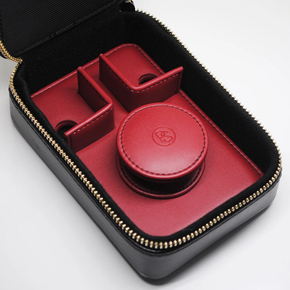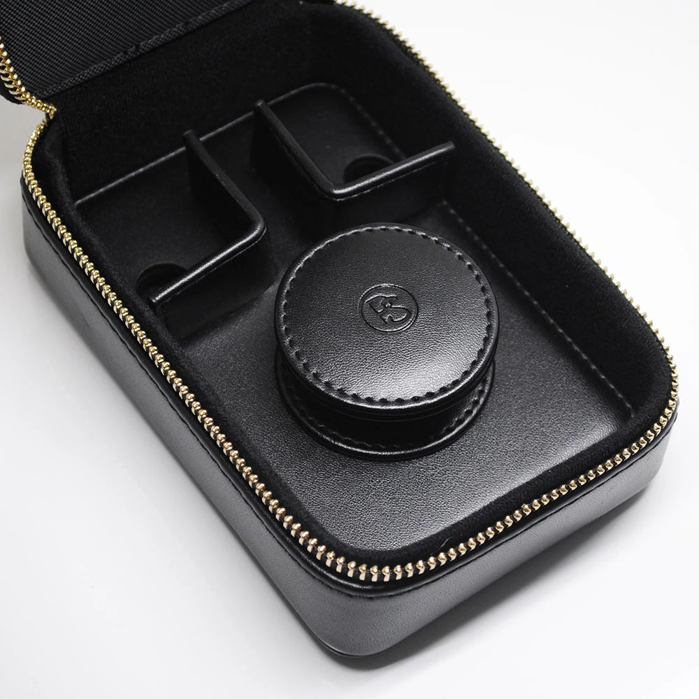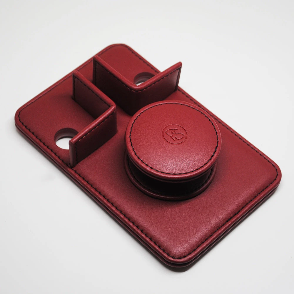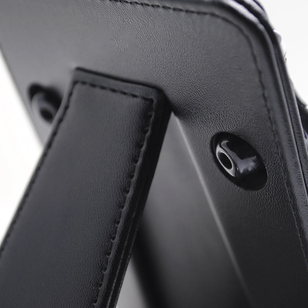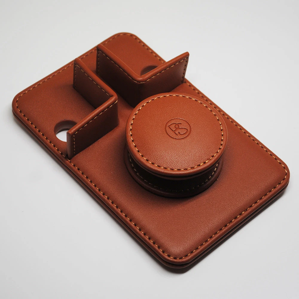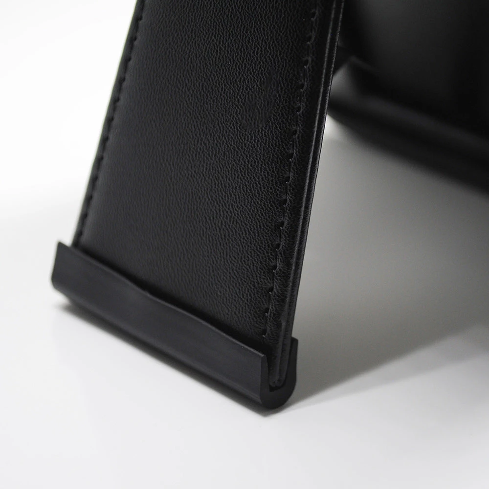 Der hintere Ständer kann auf bis zu 4,5″ ausgezogen werden und verfügt über abnehmbare Gummifüße, die für mehr Stabilität sorgen und auch auf Glasoberflächen gut funktionieren. Darüber hinaus kann der hintere Ständer in den Ständer zurückgeklappt werden und passt perfekt in unsere beliebte Ledertasche, die als erweiterter Einsatz für Reisen und unterwegs dient.